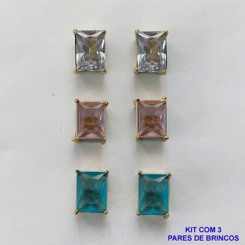 BRINCO NO BRUTO PRONTO PARA O BANHO - KIT COM 3 BRINCOS DE PINO COM ZIRCÔNIA RETANGULAR 6X8MM - PESO TOTAL 4,3GR - BRU15772