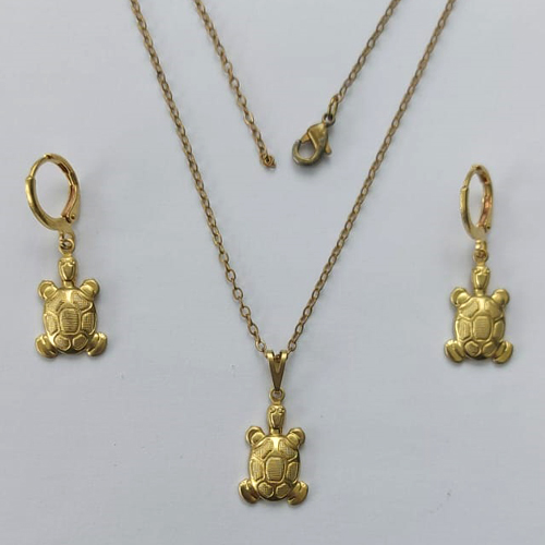 CONJUNTO NO BRUTO PRONTO PARA O BANHO - (2006) CONJUNTO COM CORRENTE CADEADO 45CM E BRINCO ARGOLINHA DE PRESSÃO E PINGENTES TARTARUGA 18MM - PESO: 3,7GR - COMPOSIÇÃO: 100% LATÃO - BRU15872